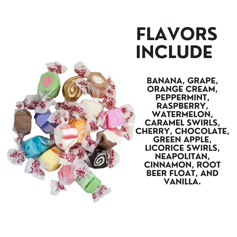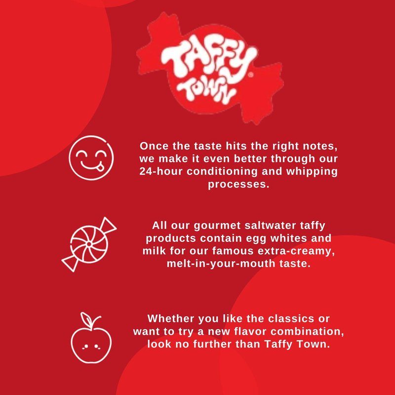 Like a sweet souvenir from your childhood, this classic assortment of salt water taffy is just as creamy, smooth and delicious as you remember Taffy Town salt water taffy comes in up to 15 assorted flavors nestled in a nostalgic box that's perfect for giving or serving. 14 ounces of Taffy Town taffy. Ingredients: corn syrup, sugar, palm oil, egg whites, evaporated milk, cocoa, molasses, sea salt, malic acid, citric acid, soy lecithin, natural artificial flavors, artificial color (including Fd C blue #1, red #3 #40, yellow #5 #6).