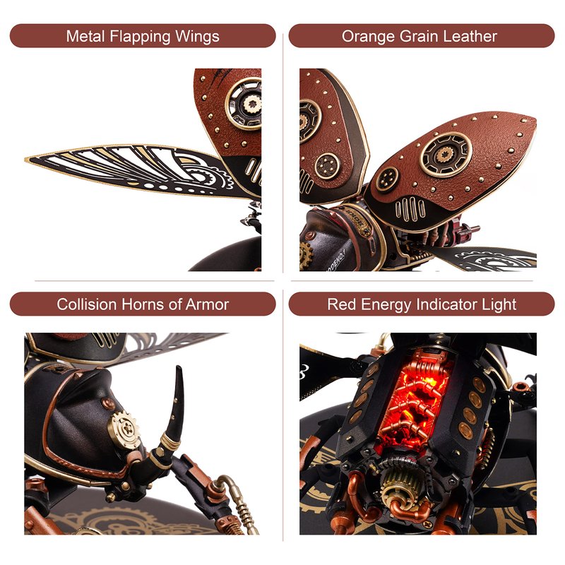 - 【Designed and Manufactured by ROBOTIME】Inspired by the real rhinoceros beetle in nature, our designers combined steampunk elements with it to create this one with a lot of details (body shape, horn, legs and wings). You can enjoy endless imaginative play with mechanical aesthetic MI01 Model.