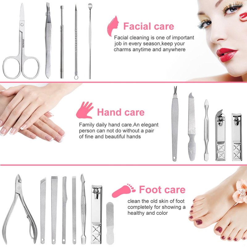 - ▶Manicure set, multiple tool options:Professional Manicure Kit contains 18 tools for hand care, facial care and foot care which can meet all of you needs.No need to pay for a single nail clippers or Nose Hair Scissors,money can be saved.Even thick nails can be easily cut off directly,No need to use a lot of force.