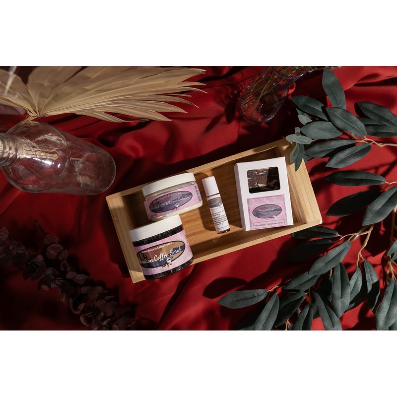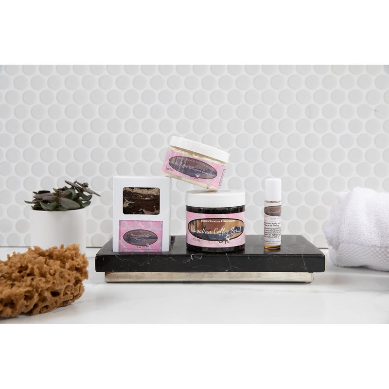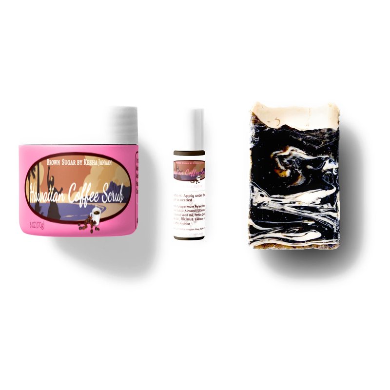 - Hawaiian Coffee Set includes Coffee Scrub, Serum, & Soap
