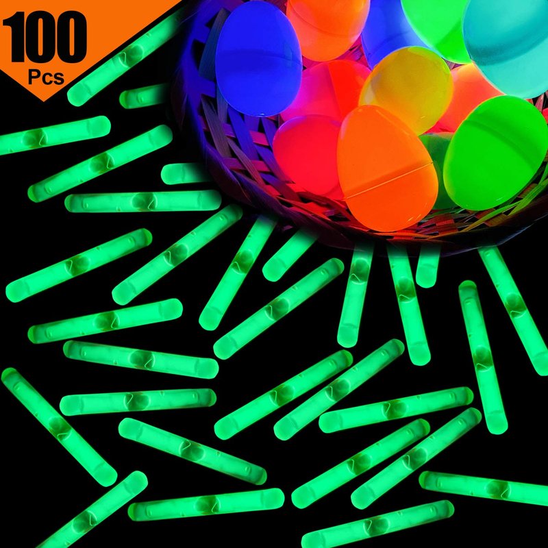 GIFTEXPRESS 100 Pcs 1.7" Mini Green Glow Sticks Our 1.7 inch green glow sticks are perfect decorative products for glow in the dark parties. For Easter night party, simply put it into the plastic eggs and hiding these glow eggs in the grass, trees or under bed, indoor, outdoor. Then start your fun Easter Egg Hunts. These glow in the dark sticks can lasting up to 10+ hours. It's great for Easter Egg Hunts, Easter Basket Stuffers, Halloween glow in the dark parties, Christmas decorations, birthday party goodie bags, night fishing floats, mountain camping, outdoor trips, and more. Glow sticks are one time use items. To activate, gently snap the stick and shake it to make it brighter.