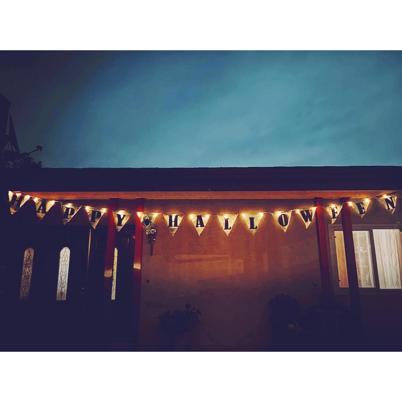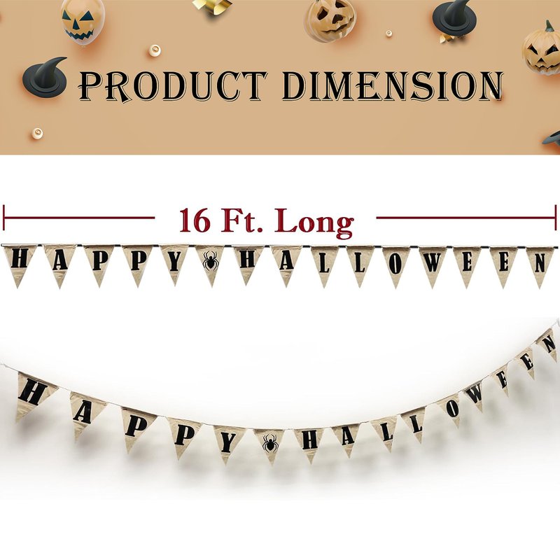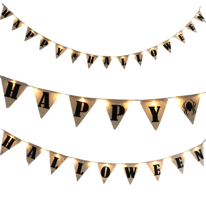 - This Halloween Banner features a triangular style with HAPPY HALLOWEEN printed on the banner and a string light that runs through the whole banner.