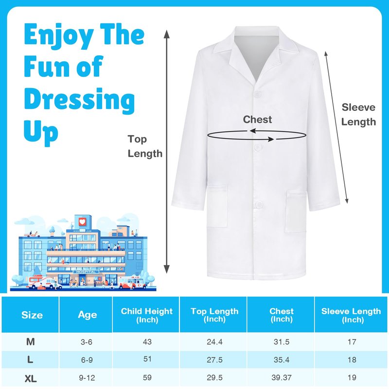 - Perfect For Kids 3-12 Years Old- This kids lab coat scientist can meet the needs of most kids. We offer 3 sizes of this doctor costume for kids, including medium for 3-5 years, large for 6-9 years, and extra large for 10-12 years. We have marked the measurement data of this kids lab coat. And recommend the suitable age for what size. Please choose the appropriate size refer to the picture.