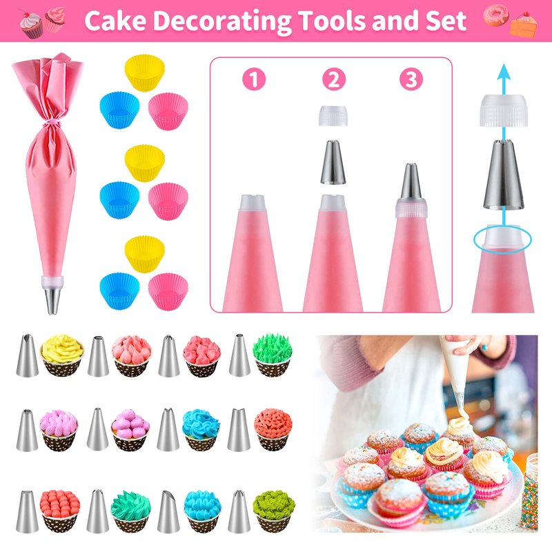Includes apron and chef hat with rainbow color, heat resistant oven mitt & mat, rolling pin, whisk, spatula & brush, measuring cups & spoons, scrapers, cookie and cupcake molds, cake decorating tools, recipe card and so on!
