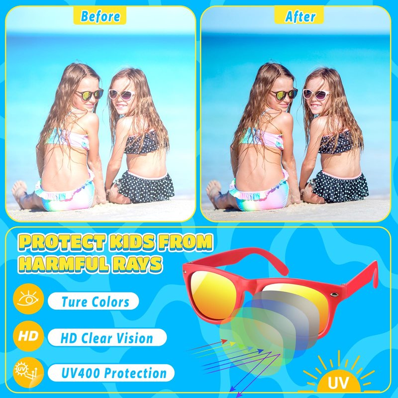 - 【UV400 Protection Sunglasses for Kids】 - GIFTINBOX kids sunglasses bulk block most of harmful UVA, UVB, and UVC rays, can greatly reduce bright sunlight and high energy visible light which can prevent children’s eyes from damage. The polarized lenses of kids sunglasses can maintain clear vision and natural color, which can lighten the fatigue state of your kid’s eyes. Perfect for summer beach or pool party and outdoor activities!