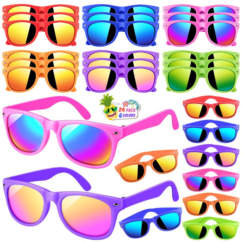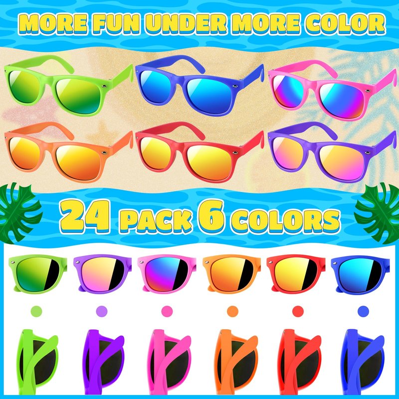 - 【2024 Latest Neon Kids Sunglasses Bulk】- Brighten up your little ones' day with these fun and fashionable kids sunglasses! Totally 24 pack could meet your party's needs and the super cool outlook makes kids love it. The frame of each pair measures 5" W x 1.65" H x 4.75“ L. Sized smaller specifically for kids ages 3-8. These sunglasses for kids are a must-have party favor for your kids this summer!