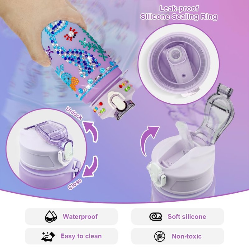 - A variety of diamond pattern stickers: There are 6 ocean-themed diamond stickers in the kids water bottle kit, the patterns include mermaid, starfish, octopus, shark, whale, seaweed, seahorse, sea fish, crab, flowers, pearls, gemstones and so on, a variety of patterns to choose from, kids can give free play to the design, decorate their own unique water bottle