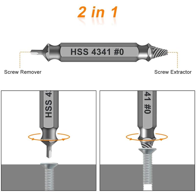 - USER FRIENDLY - Two easy steps, first you just need a drill, select a bit smaller than the damaged screw and begin the extraction by using the drill bit/burnishing tip and drill down to create a clean hole (make sure to run the drill in reverse during the process). Next switch the drill bit to the extraction tip and using consistent, downward pressure (and a slow speed) allow the extraction tip to “bite” into the damaged screw, and then you can easily remove the screw.