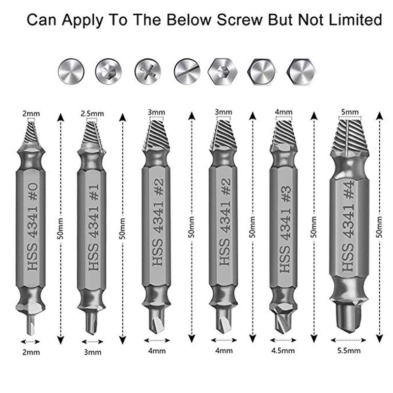 - 6-PIECE SCREW EXTRACTOR SET - The screw extractor set(#0, #1, #2, #2, #3, #4) works with any drill and any size screw or bolt. This damaged screw extractor can remove all common sizes of damaged, stripped or broken screws.