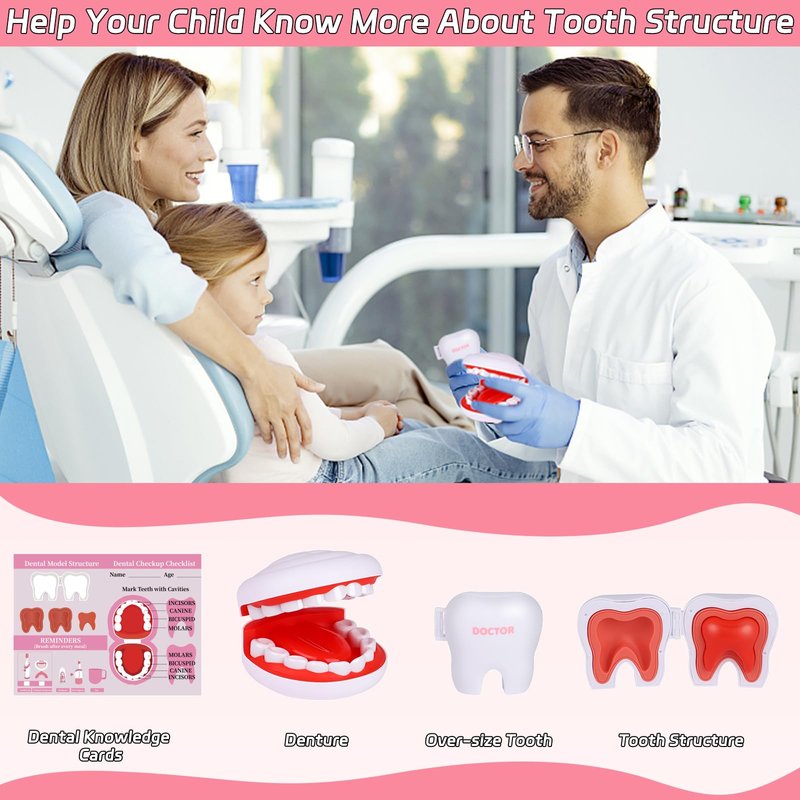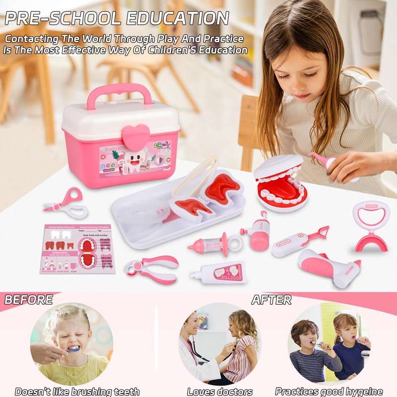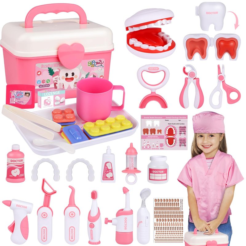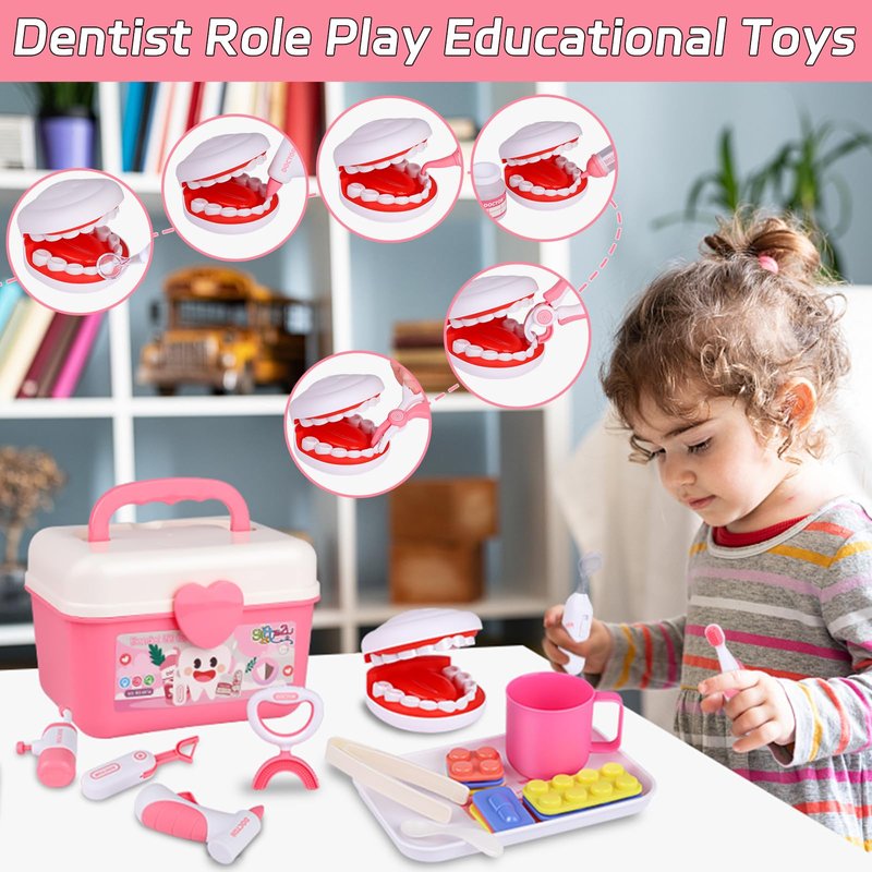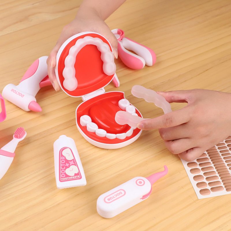 - Kids Dentist Playset: A fun and engaging way to teach good dental health practices, and to ease kids' fears or feelings of stress associated with a visit to the dentist. Our doctor kit for toddlers 3-5 are meet the safety requirement of ASTM, kids dentist kit design with Smooth and rounded edges, no sharp points or corners which is safe for kids during play. This kids doctor playset is made of environmentally friendly and child-safe plastic, is easy to clean for the utmost hygiene.