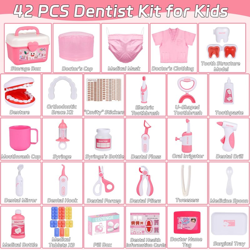 - Complete Dentist Kit: Gifts2U 42-piece Dentist Toys comes with every imaginable tool that a future dentist will need, includes set of pretend teeth, tooth structure model, examination tools, toothbrush, toothpaste tube, dental rinse bottle and cup, braces, doctor's suit, mask, reusable ID tag, double-sided reusable activity card, Tray, etc.