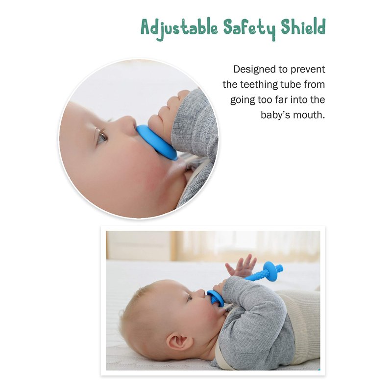 - COMES WITH ORIGINAL CHOKE-PROOF SAFETY PROTECTION SHIELDS: Includes two removable and adjustable safety shields that can be attached to the teething tube to ensure its end remains at a safe distance from the baby's throat. This feature is important, it ensures safety while keeping the tube teether soothing teething irritation effectively.