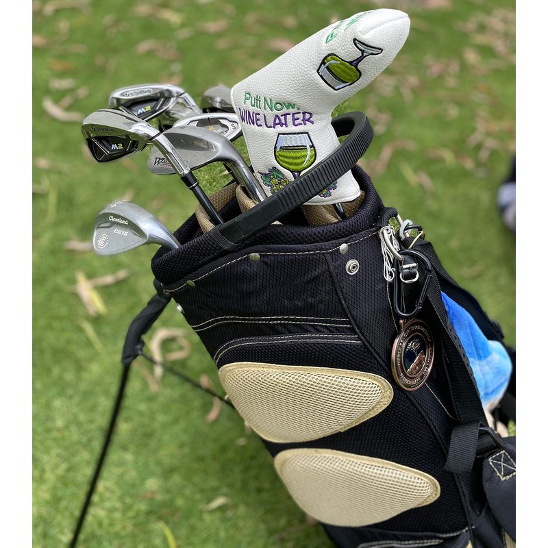 Add some fun to your golf bag with these one-of-a-kind Giggle Golf Putter Covers! These designs fit standard blade putters. This putter cover design has an easy-to-use magnetic closure, embroidered with grapes, white wine, and red wine glasses, and says, "Putt Now, Wine Later."