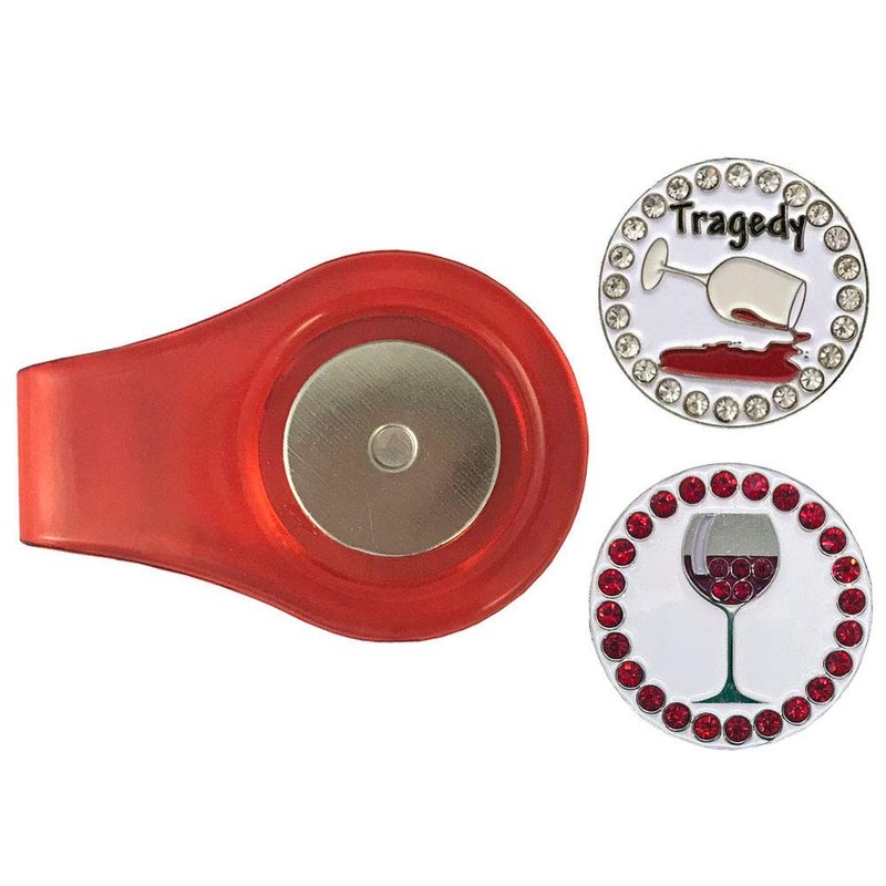 - ONE CLIP WITH TWO BLING GOLF BALL MARKERS - This golf ball marker clip comes with one translucent red ball marker clip and two Red Wine themed ball markers: a Glass Of Red Wine and a Tragedy (Glass Of Red Wine Spilling).