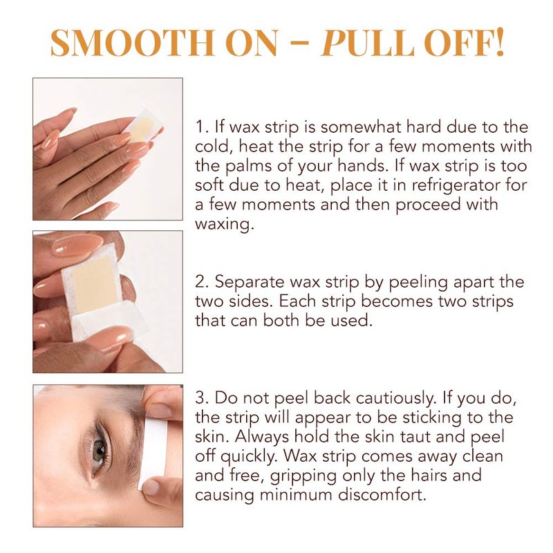 - ERGONOMIC EPILATING WAX STRIPS: Apply this hair removal strip wax on the desired area, pull from the opposite direction of hair growth and you’ll have soft and hairless skin in just a matter of minutes without any mess! And since they're petite, you can maneuver them around even the tightest nooks and crannies of your brows. They stick to only the hair and not on the skin that will give you the smooth texture that is perfect for removing unwanted hairs even on small areas and touch-ups!