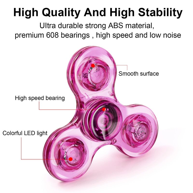 - 【Durable and Sturdy】Our light up fidget spinner pack use high quality crystal ABS material, which is fall resistance and durable, not easy to damage, premium 608 steel bearing provides much smoother and less noise. Rotation time: about 60s, will bring you more challenges and fun.