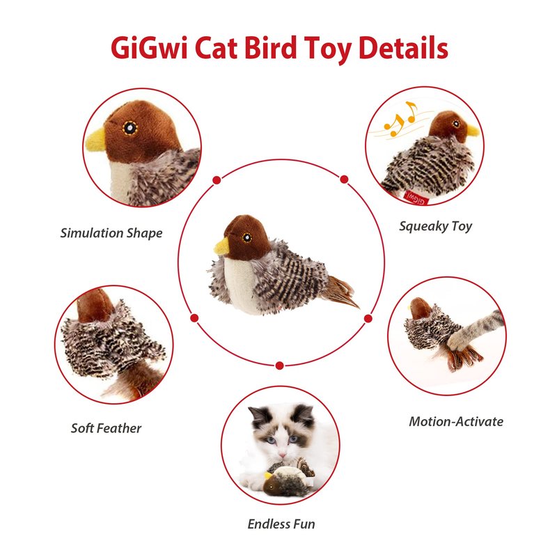 Gigwi Cat Toys for Indoor Cats, Interactive Cat Toy with Real Chirping Bird Electronic Sound, Cat Feather Toys with Soft Plush Relieve Boredom