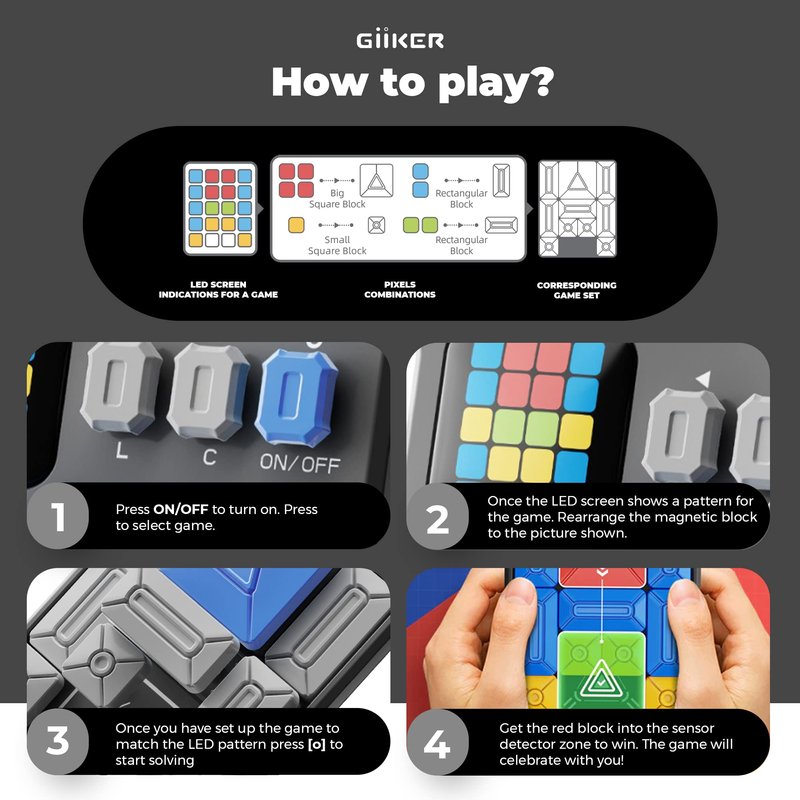 - ULTIMATE GOAL - Set up the game as shown on the LED Screen, the goal is to slide the red square block to shift the big square block to the automatic detection zone which is located at the bottom middle.