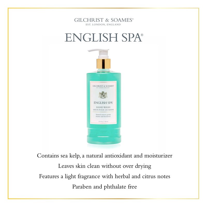 The English Spa Collection encapsulates our heritage, combining classic English botanical scents with the refinement and purity of modern luxury spa products. Our English Spa Hand Wash contains therapeutic ingredients to create a rich, fragrant lather that cleanses without leaving hands dry. Moisture-rich marine nutrients, vitamins and extracts leave hands conditioned and hydrated while the warmth of water releases its fresh fragrance of citrus and herbs. Contains sea kelp, a natural antioxidant and moisturizer Leaves skin clean without over drying Features a light fragrance with herbal and citrus notes Paraben and phthalate free Ingredients This English Spa product contains natural sea kelp. Nutrient packed sea kelp helps to soothe, nourish and calm dry skin, leaving it moisturized and supple. The Collection Indulge in simple luxuries and encourage the incomparable feelings of possessing no care in the world with English Spa. Gilchrist & Soames English Spa collection is designed to reflect a sense of place, taking you on a journey to evoke special memories, emotions, stories and experiences. The collection may remind you of the English Countryside, memories of gondola tours in Venice or a stroll in Versailles Palace gardens. The English Spa Collection features the Gilchrist & Soames Signature Formulations, which contain no parabens, phthalates, petrol-derived ingredients, mineral oil, urea, DEA, TEA, or propylene glycol. They do contain food-grade, naturally derived USP glycerin and natural conditioning agents from honey and the brassica plant. We�re also committed to cruelty-free development and vow to never test our products on animals.