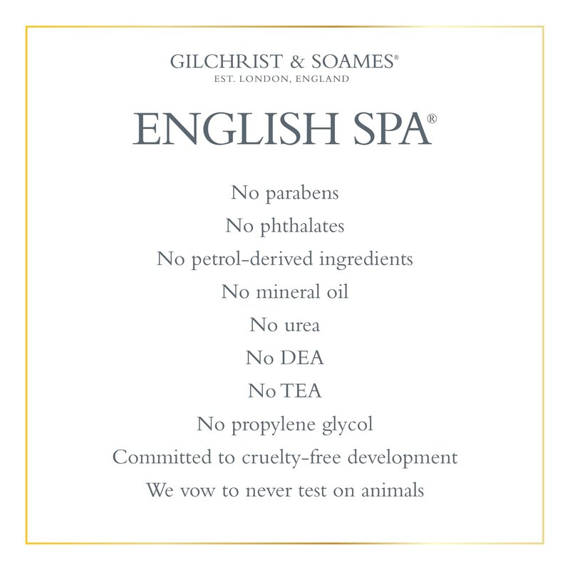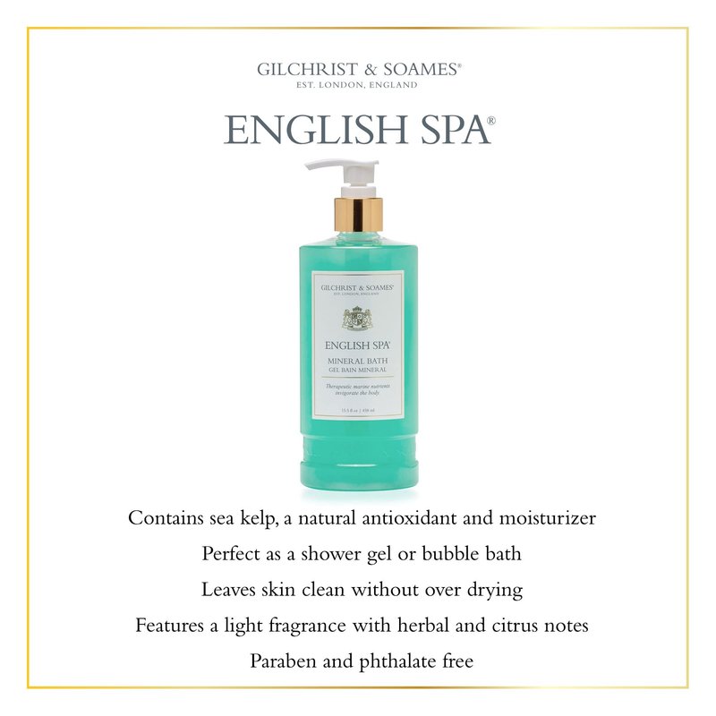 The English Spa Collection encapsulates our heritage, combining classic English botanical scents with the refinement and purity of modern luxury spa products. The Spa Sea Kelp Mineral Bath contains therapeutic marine nutrients, vitamins, and extracts that invigorate the body. Leaves behind a light, fresh fragrance of citrus and herbs. Contains sea kelp, a natural antioxidant and moisturizer Perfect as a shower gel or bubble bath Leaves skin clean without over drying Features a light fragrance with herbal and citrus notes Paraben and phthalate free Ingredients This English Spa product contains natural sea kelp. Nutrient packed sea kelp helps to soothe, nourish and calm dry skin, leaving it moisturized and supple. The Collection Indulge in simple luxuries and encourage the incomparable feelings of possessing no care in the world with English Spa. Gilchrist & Soames English Spa collection is designed to reflect a sense of place, taking you on a journey to evoke special memories, emotions, stories and experiences. The collection may remind you of the English Countryside, memories of gondola tours in Venice or a stroll in Versailles Palace gardens. The English Spa Collection features the Gilchrist & Soames Signature Formulations, which contain no parabens, phthalates, petrol-derived ingredients, mineral oil, urea, DEA, TEA, or propylene glycol. They do contain food-grade, naturally derived USP glycerin and natural conditioning agents from honey and the brassica plant. We�re also committed to cruelty-free development and vow to never test our products on animals.
