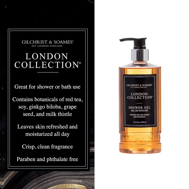 London Collection products are the complete package of understated elegance and sophistication; a brilliant clean with a luxury feel. Antioxidant-rich botanicals of red tea, soy, ginkgo biloba, grape seed, and milk thistle, provide superior moisturization and a luscious lather complete with nutrient-rich oils, humectants, and emollients to leave skin smooth and silky. Great for shower or bath use Contains botanicals of red tea, soy, ginkgo biloba, grape seed, and milk thistle Leaves skin refreshed and moisturized all day Crisp, clean fragrance Paraben and phthalate free The Collection Gilchrist & Soames London collection is designed to reflect a sense of place, taking you on a journey to evoke special memories, emotions, stories and experiences. Sophistication and style are inspired by the strong architecture of major cities in the world. The London Collection takes you on a journey from London to Paris, Rome or New York. The London Collection features the Gilchrist & Soames Signature Formulations, which contain no parabens, phthalates, petrol-derived ingredients, mineral oil, urea, DEA, TEA, or propylene glycol. They do contain food-grade, naturally derived USP glycerin and natural conditioning agents from honey and the brassica plant. We�re also committed to cruelty-free development and vow to never test our products on animals.