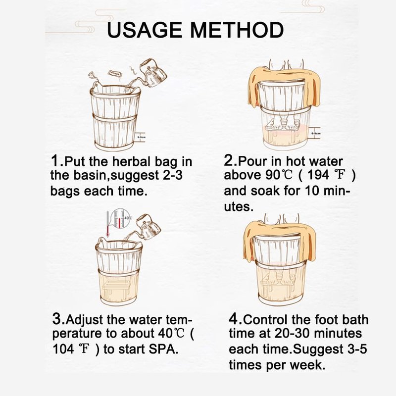 - Natural and practical natural herbs, carefully selected, scientific formula.. Put the herbal bag into the 40℃~45℃ water directly, then foot bath for 15-30 minutes. Suggest 3-5 times per week.