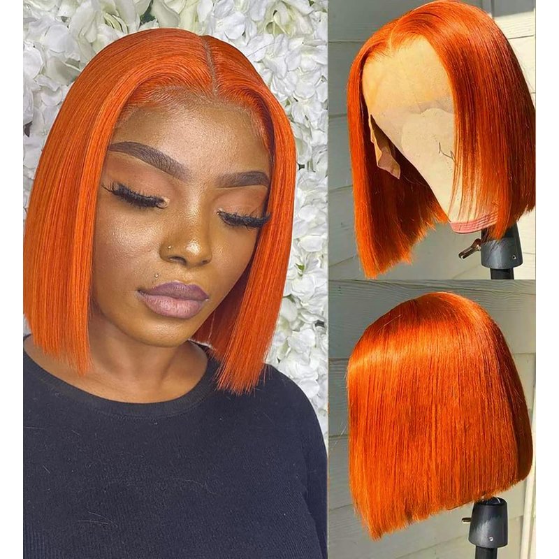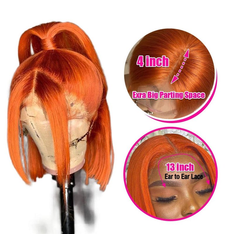 - Orange Bob Wig Human Hair Material: 9A Grade 100% unprocessed virgin human hair wigs lace front wigs, cut from young donor directly, soft, no smell, clean and comfortable against skin, can Middle Part or Free Part.