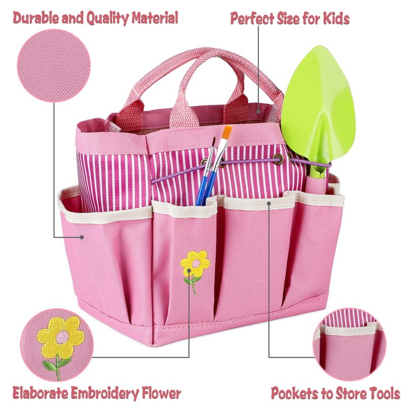 - 【Premium Quality & Safe Use】Kid’s safety always comes first. Our children gardening tools are made of quality material with metal heads and plastic handles without sharp edges. The gardening gloves and apron will helps prevent kids from hurting during gardening. A sturdy storage gardening tote included for taking as you need and keeping the tools organized.