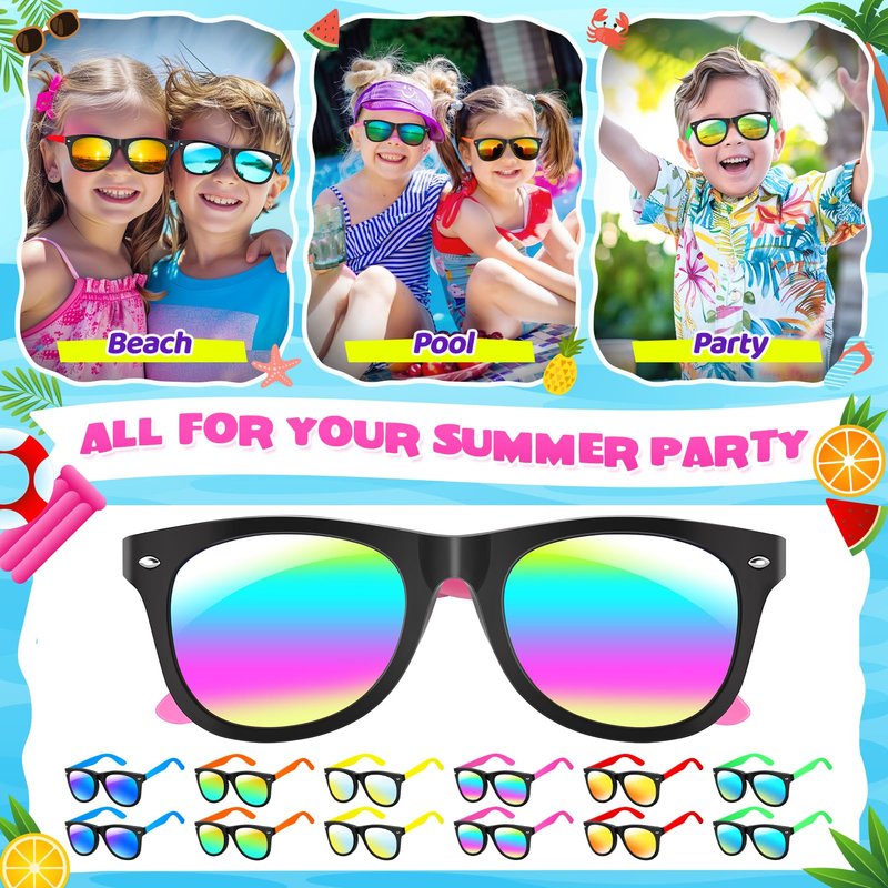 - 【GREAT PARTY FAVORS】- Cool Sunglasses must be the most popular gift for kids in the pool parties, beach parties, birthday parties, summer camp, graduation parties and outdoor adventure. let the good times roll!