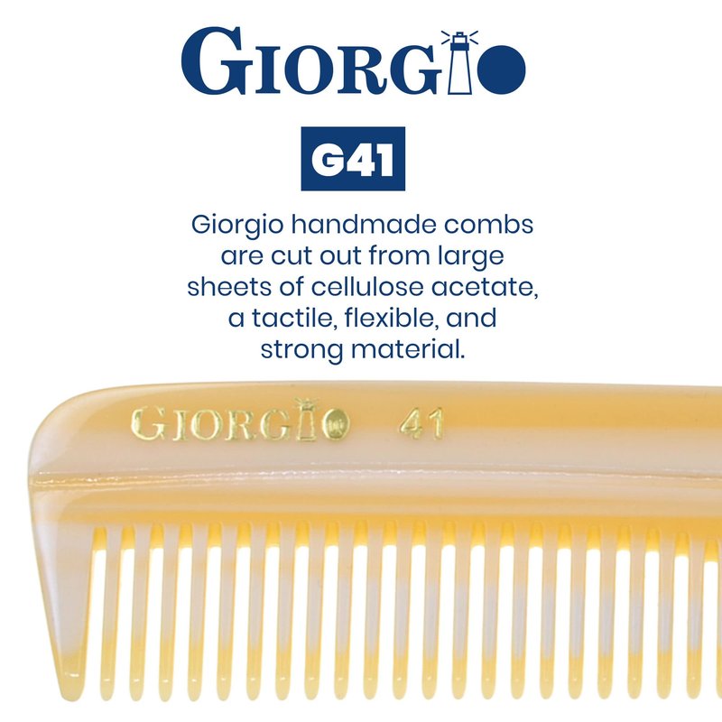 Giorgio G41 Pocket Comb 5.1 Inch Small Ivory finish. Coarse / Fine teeth, Flexible women and men Hair, Beard & Mustache Pocket Comb. Hand-Made of quality Durable Cellulose, Saw cut and Hand Polished for ultimate and effortless smooth glide. Prevent Pulling and hair breakage. Rounded tips for sensitive scalps and release of hair's natural oils. Hand Made of quality Cellulose , a non-petroleum base material, that’s why they have minimal static.Smooth, rounded teeth for sensitive skin stimulating the hair cuticle’s and release of hair's natural oils for a hair strong and healthy. Anti-static. A women and men favorite comb for both hair and quick beard and mustache care. Easier to clean than wood. Unlike beard brushes, combs for beard and moustache are best used on damp hair. Ease to clean with shampoo under the tap.