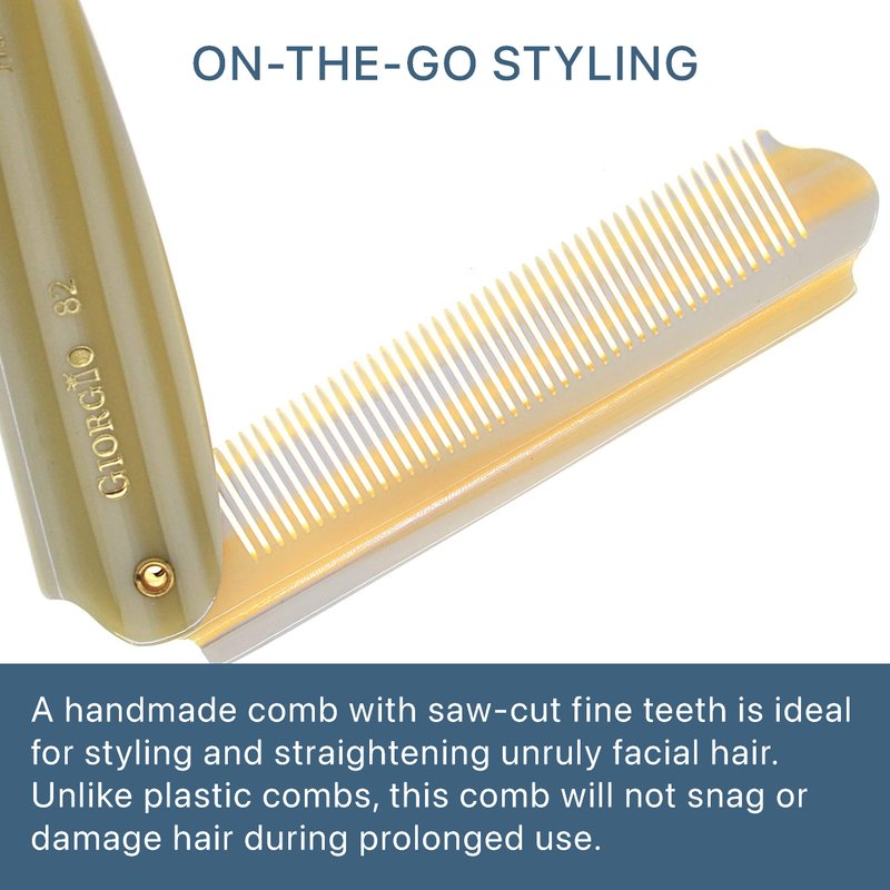 Giorgio GIVY82 Pocket size: 7.87 inch open and 4 inch closed. Gentleman's Handmade Ivory Folding Pocket Comb Hair, Beard & Mustache Pocket Comb, fine toothed for perfect Hair combing and for beard and moustache. Small men’s pocket comb, for a quick touch-up for Hair, mustache & beard. Perfect for travel, great for the car or office. You will find it easier to untangle any knots and style your hair, moustache and beard properly. Use the beard & mustache comb while to style your beard and keeps its shape. Made of cellulose acetate a non-petroleum base material, that’s why they have minimal static, saw-cut by special circular saws and hand polished for ultimate and effortless glide, preventing pulling or ripping the hair.Smooth, rounded teeth for sensitive skin stimulating the hair cuticle’s and release of hair's natural oils for a strong and healthy hair. Anti-static. The perfect man gift. Fits in your pocket pants, shirts or bags, you can groom your facial hair anytime, anywhere. Easier to clean than wood. Best for work on damp hair. Ease to clean with shampoo under the tap.