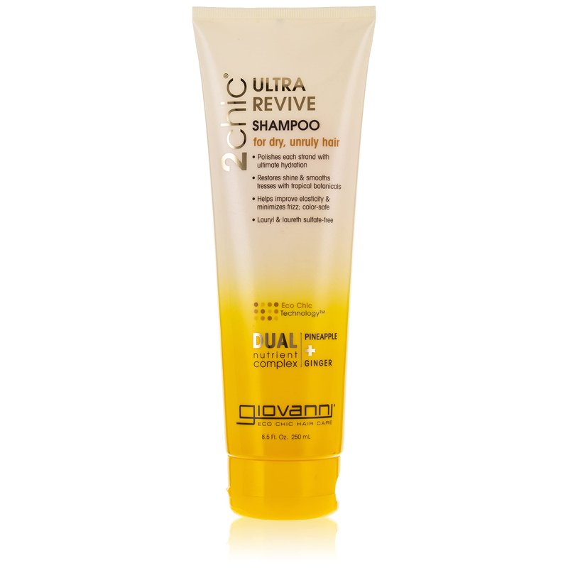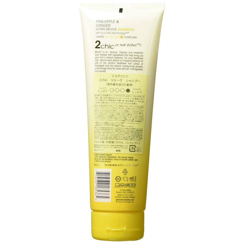 GIOVANNI pineapple & ginger 2chic ultra-revive shampoo comes in an 8.5 fl oz tube. Our pineapple and ginger shampoo nourishes hair with vitamins b, c and e while tropical botanicals restore shine and smooth your tresses. This product is made with 100% vegetarian ingredients and does not contain parabens or dyes. Our shampoo is certified cruelty-free and not tested on animals.