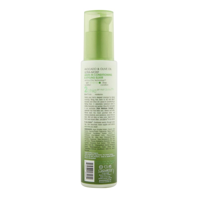 - COLOR SAFE - GIOVANNI 2chic Ultra-Moist Leave-In Conditioning & Styling Elixir is 100% color-safe and nourishes hair with a proprietary blend of vitamins, antioxidants, and omega fatty acids without stripping color