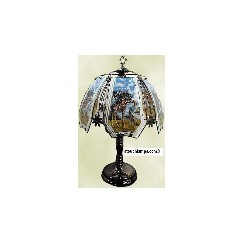 Standing 23" tall the base has a Pewter-colored (black chrome) finish. Touching the base anywhere turns the lamp on and off and controls the 3 power settings. What makes this lamp special, however, is the shade. In a black metal framework are 6 panels of glass. Each panel has a picture of a large giraffe. The diameter of the shade is approx. 14 inches so this is a nice size lamp. This lamp will enhance many different decors and makes a wonderful gift. The lamp uses 3 15-watt bulbs which are included. It can use up to 25-watt bulbs. Some assembly is required for all of our lamps.