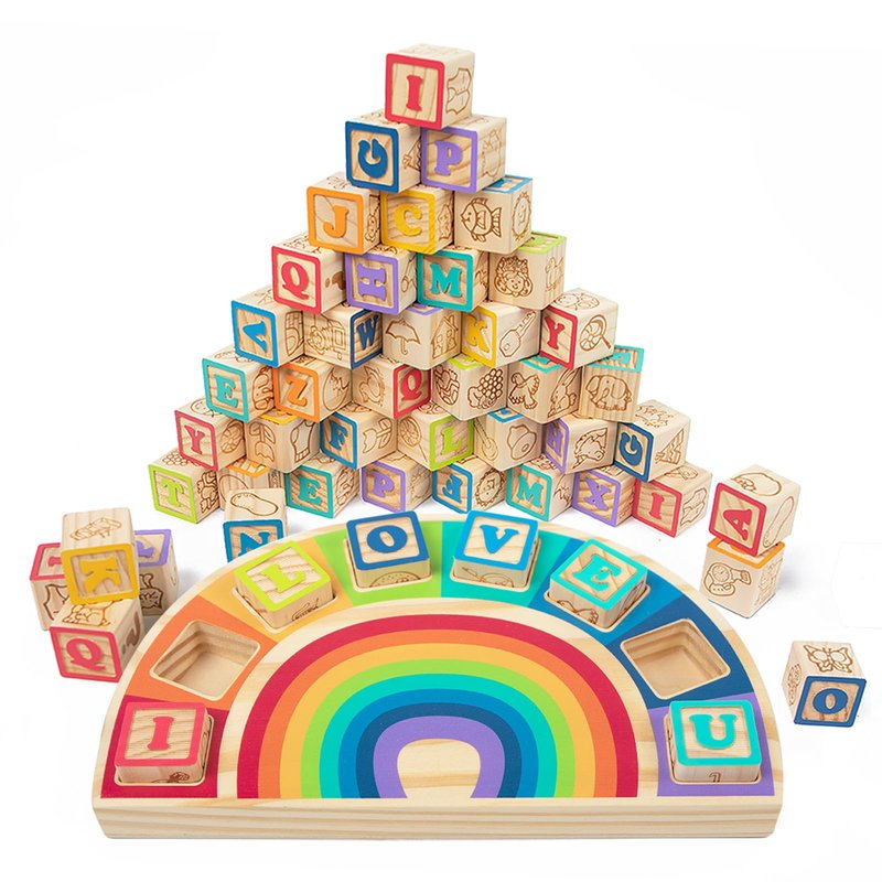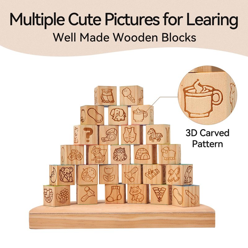 - Unique Design: 27 traditional-style solid wood blocks featuring animals, fruits and letters, the soft and soothing colours capture babies' attention and encourage visual development. Your baby will enjoy stacking and knocking them down, which is the best part! These blocks bring joy and developmental benefits to children.