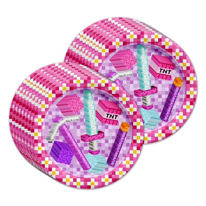Girl Pixel Mining Birthday Party Supplies Set Plates Napkins Cups Tableware Kit for 16