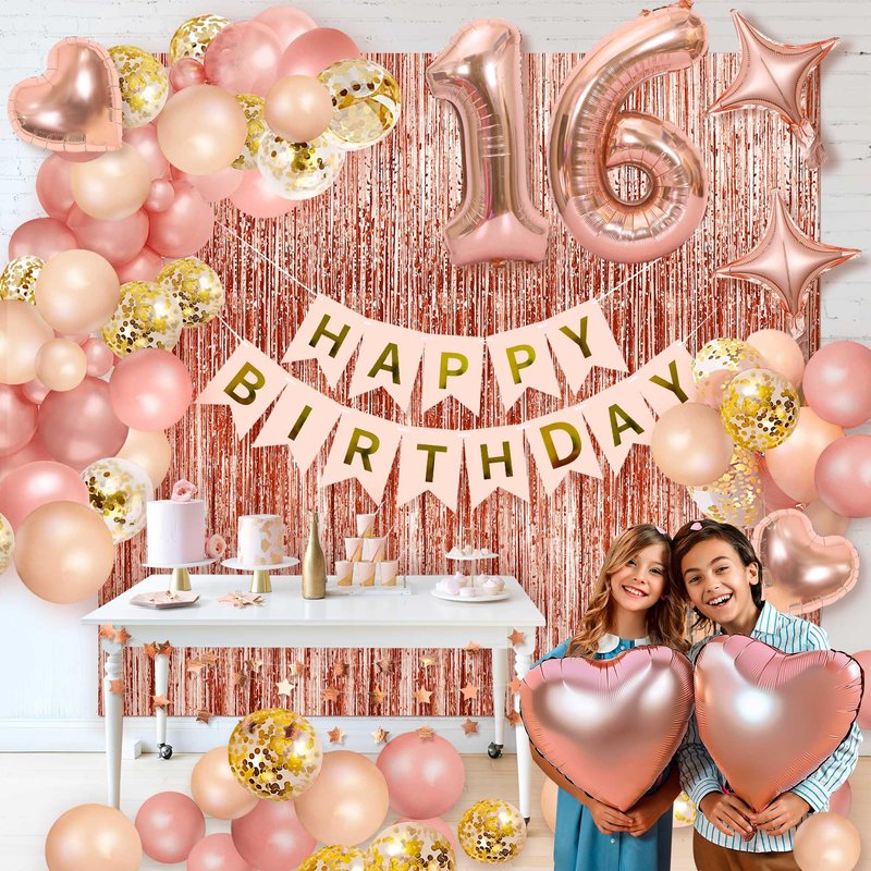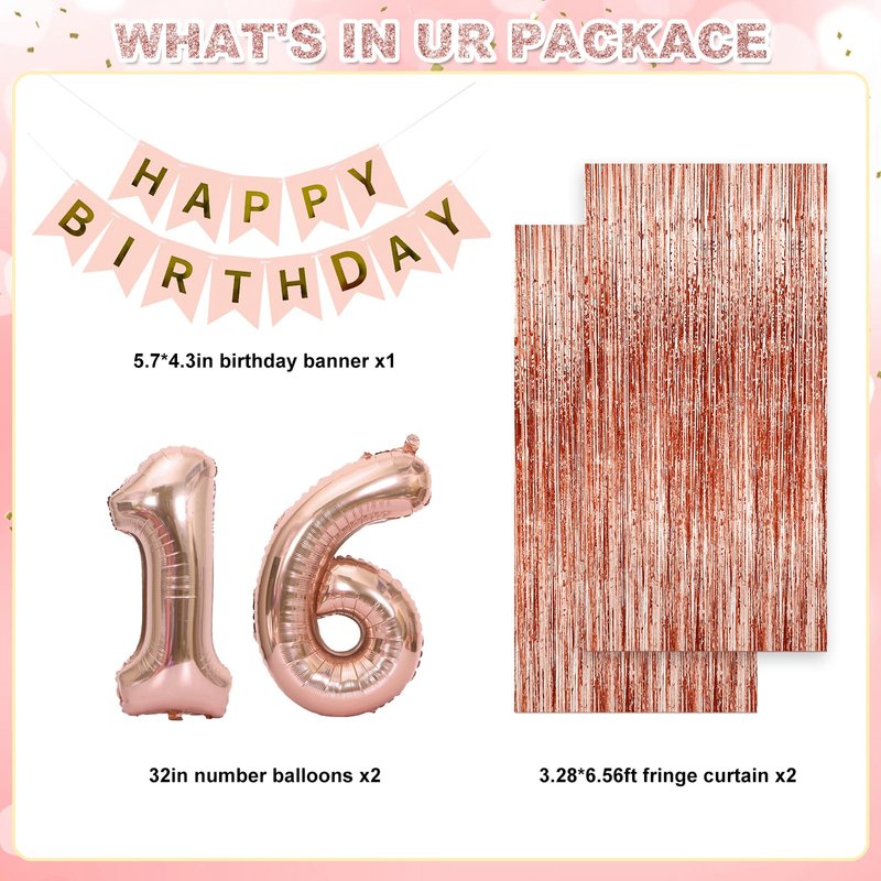 - Rose Gold Birthday Decoration Set: Rose Gold Foil Tassel Curtains*2, 32-inch Digital Foil Balloons*2 (Warm Tips: 1-9 years old only has 1 32-inch balloon), Happy Birthday Banner*1, 12-inch Confetti Balloons*12, 10-inch Balloons (Rose Gold*12, Vintage Colors*12) 18-inch Rose Gold Heart Foil Balloons*2, 10-inch Star Foil Balloons*2, 5-Star Tassels Garland*1, Hanging Swirl*6, Cake Topper*1, Balloon Arch Chain*1, 100pcs Balloon Sticky Tape*1 roll, 24-inch Rose Gold Crown*1, Balloon Ribbon*1 roll,