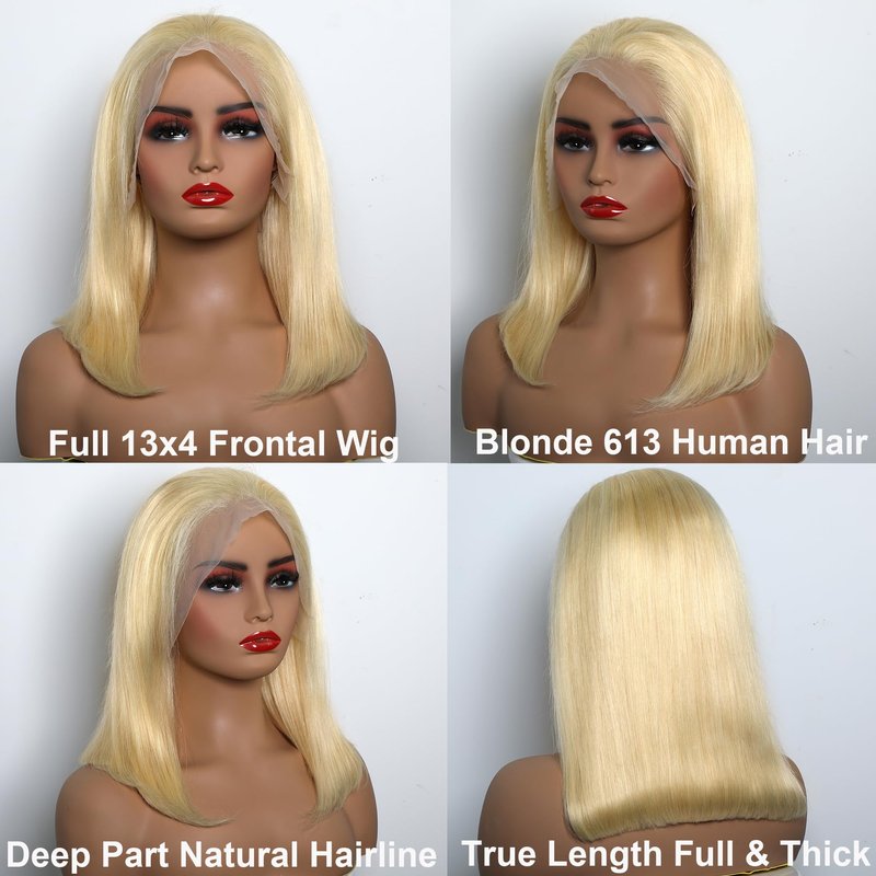 - Blonde 613 Full 13x4 Bob Wig: 100% Brazilian Unprocessed 12A Virgin Remy Color Human Hair 10 Inch Short Straight Frontal Wig 180 Density.