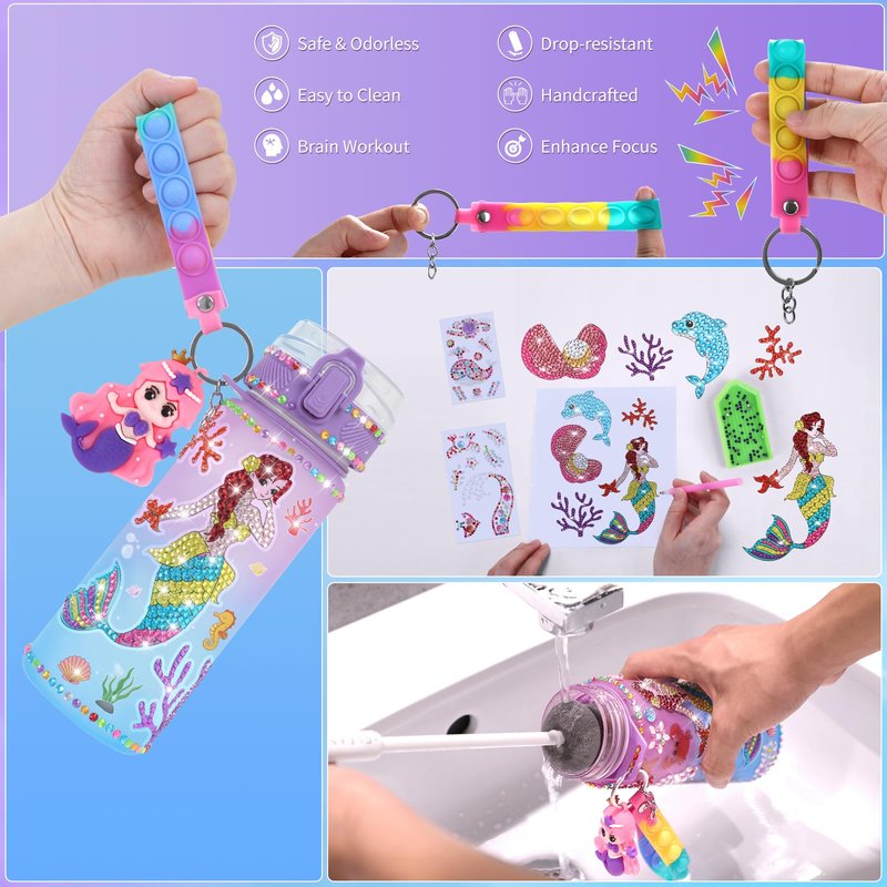 - 🌞 𝐌𝐞𝐫𝐦𝐚𝐢𝐝 𝐖𝐚𝐭𝐞𝐫 𝐁𝐨𝐭𝐭𝐥𝐞 𝐊𝐢𝐭: Experience endless fun with our mermaid themes DIY water bottle kits! Set includes 600ml/20oz water bottle *1, mermaid pattern sticker *1, gemstone sticker *3, cartoon sticker *2, multi-color diamond bag *1, plastic tray *1, diamond pen *1, mini mermaid pendant*1, jelly gel *1, mini keychain *1, inspiration sticker *1, ziplock bag *10. Whether it's a gift or a personal project, our DIY water bottle is sure to delight any young girl who loves arts and crafts!