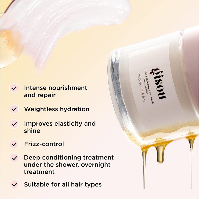 - Honey Infused Travel-Sized Hair Mask. Gisou's deeply nourishing hair mask with sustainably sourced Mirsalehi Honey hydrates and repairs hair for softer, stronger, more manageable locks.