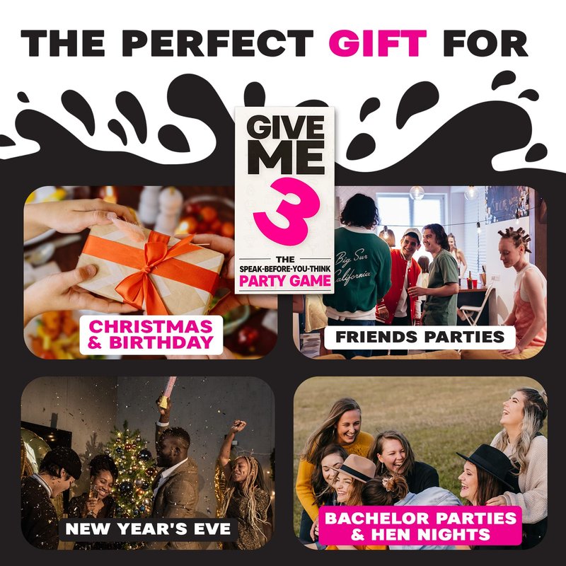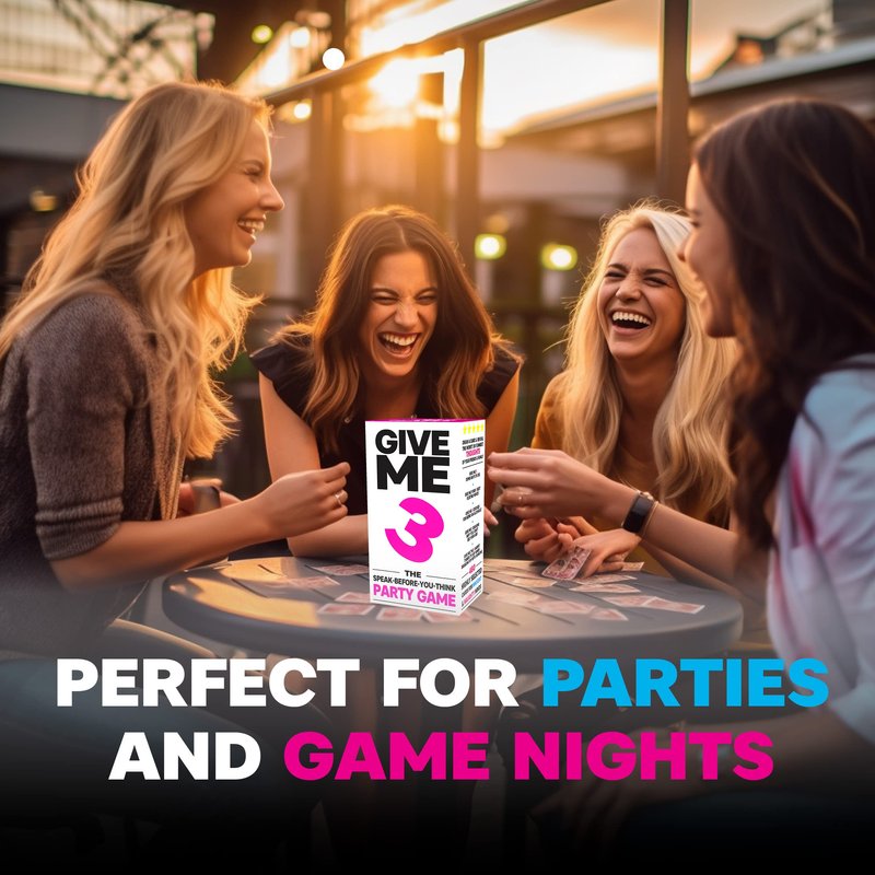 - 🤣 LAUGH & HAVE FUN WITH GIVE ME 3 - THE ULTIMATE PARTY GAME! Start the party with hilarious questions like "Give me 3 things you can say about a drink but not about your partner?" Enjoy endless laughter, wit, and wild moments