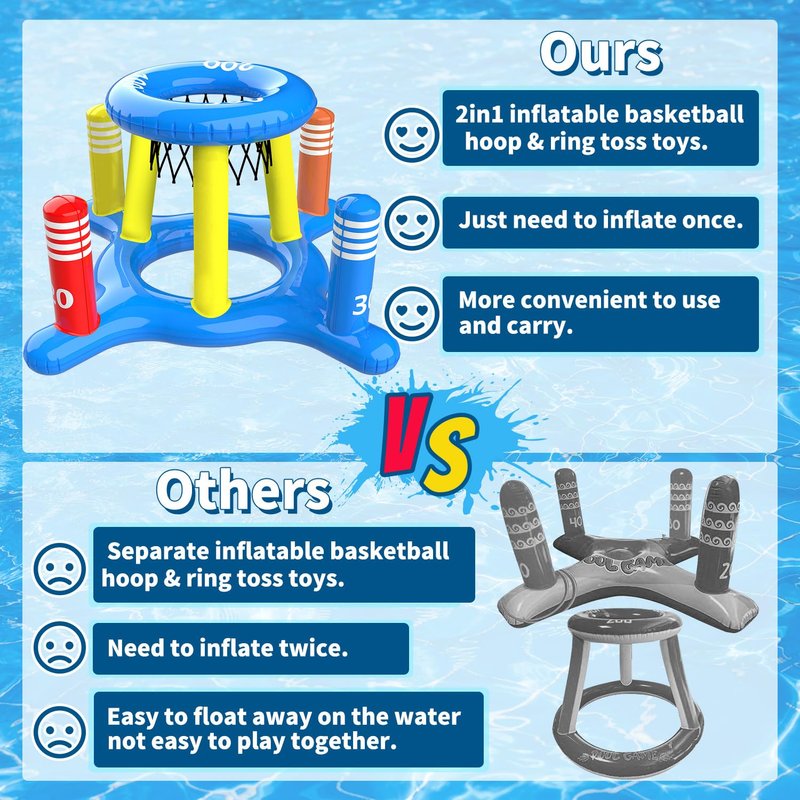 - 【Coolest Pool Toys Games Set】: 2 in 1 Floating Inflatable Basketball & Ring Pool Floats Toy, just need to inflatable once and you will get 2 different water game experience! This inflatable toss game pool toy set truly takes pool fun to a whole new level for kids and adults! Great for a fun day at the pool with friends and family.