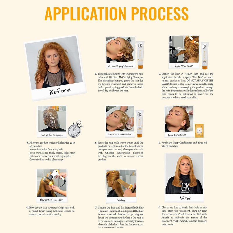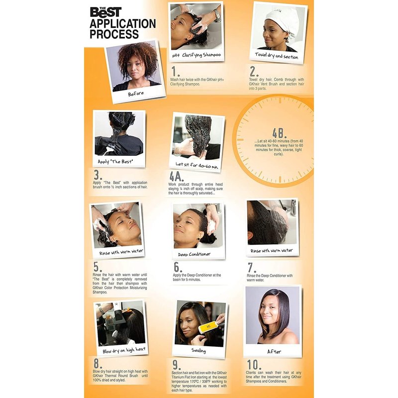 THE BEST HAIR STRAIGHTENING TREATMENT. GKhair The Best Keratin Treatment is a Salon Professional Hair Smoothing and temporary straightening treatment for frizzy hair, it strengthens your hair for up to 5 months. This hair smoothing treatment reduces the stiffness (elastic modulus) in the hair, this reduction causes the hair to lose its natural curl pattern and eliminate frizz. The Best gives the hair natural softness, eliminating the curly roughness of the hair and leaving it with pliable silkiness. It helps to tame the hair for up to 5 months during a single salon professional service. The Best penetrates the hair shaft and delivers important conditioning and moisturizing benefits. The Best is keratin Formula, which is ideal for keratin hair straightening of any type, making it smooth, soft and shiny for up to 5 months. Keratin is the main protein that makes up hair. When there is enough keratin, the hair remains strong, healthy, shiny and straight. During the keratin straightening procedure, keratin penetrates the hair, providing nutrition and hydration. This has a positive effect on the general condition of the hair, it becomes stronger and better tolerates daily negative factors like drying with hot air or straightening with an iron, curls and more. After GKhair The Best keratin straightened hair looks brilliant!