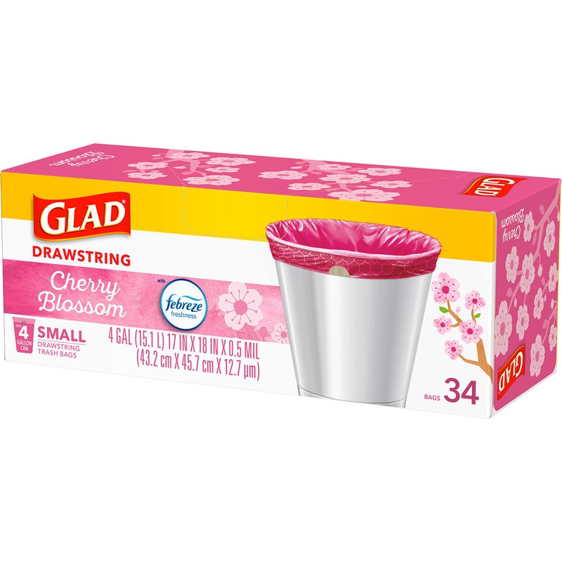- 4 GALLON PINK TRASH BAGS: Handle your daily household trash needs with Glad's small sized 4-gallon pink drawstring garbage bags in Cherry Blossom Scent