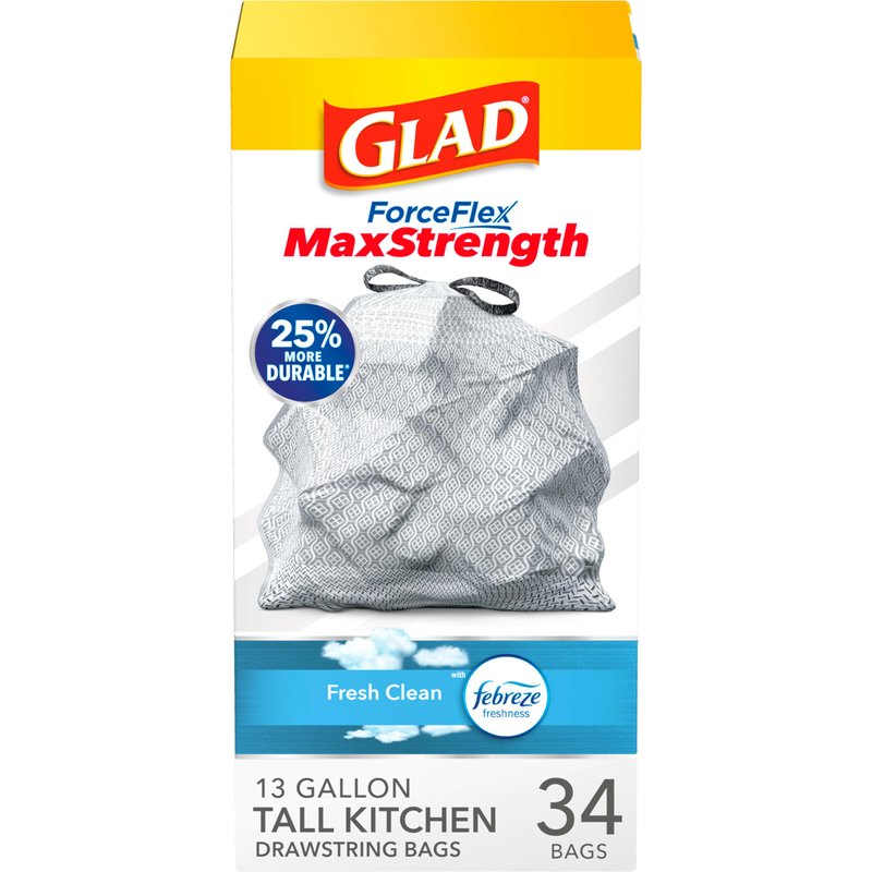 - GLAD TRASH BAGS WITH FORCEFLEX MAXSTRENGTH: Handle daily kitchen and household demands with Glad's 13 gallon tall kitchen garbage bags in a Febreze Fresh Clean scent