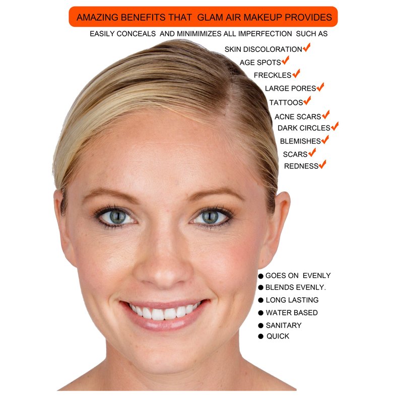Flawless, water-based airbrush makeup in 0.25 oz size. For all skin types. Our Matte series will give you an amazing healthy glow and is preferred for normal to oily skin. Water based, oil free, alcohol free, with vitamin E and minerals. Long wearing over 12 hours. If you enjoy a shine-free matte look, as if you've just applied a fresh layer of powder, then you'll love this coverage! Flawless satin airbrush foundation in 0.25 oz size. For normal to dry skin. Our Satin series will give you an amazing healthy glow. Water based, oil free, alcohol free, with vitamin E and minerals. Long wearing over 12 hours. If you enjoy a fresh, dewy look, as if you've just left the spa, then you'll love this coverage! We also have a beautiful array of eye shadows, blushes, shimmers, and bronzers! Choose from our extensive color pallet. Whether you're going for a soft and sensual look or a bold and sultry look, we have the color for you! Our blush also works great as a long wearing lip color...simply add your own lip gloss to complete this look! Check it out now!