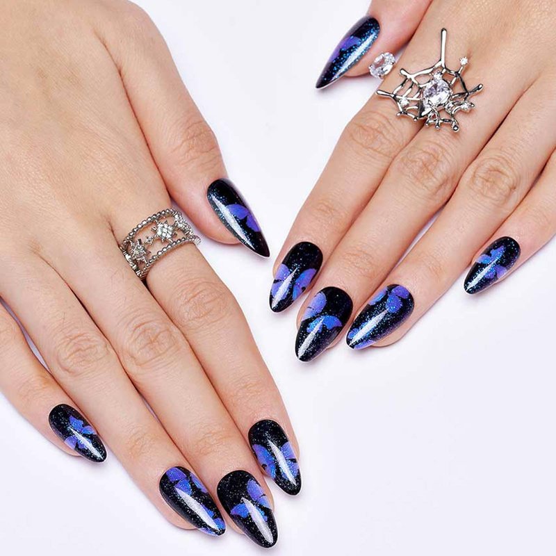GLAMERMAID Press on Nails Almond,Black Gel False Nails with Butterfly Design,24 PCS Glue on Nails,Reusable Acrylic Stick on Nails Tips Manicure Set for Women,Night Butterfly