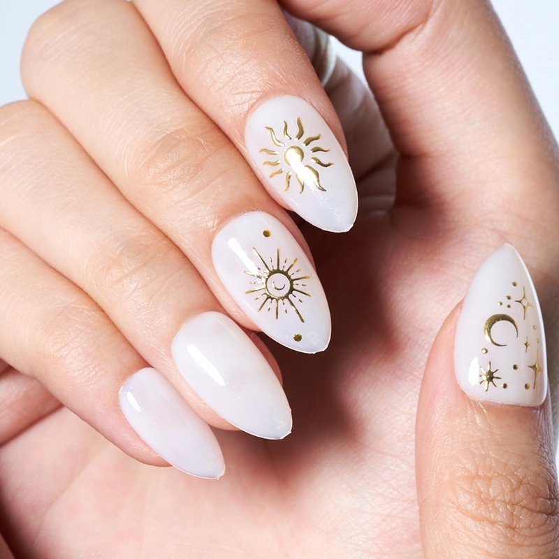 GLAMERMAID White Press on Nails Short Almond, 3D Gothic Handmade Stick Glue on Nails with Golden Star Blossom Design, Medium Oval Reusable Fake Nails Acrylic False Nails Manicure Kits for Women Gift