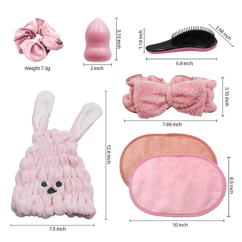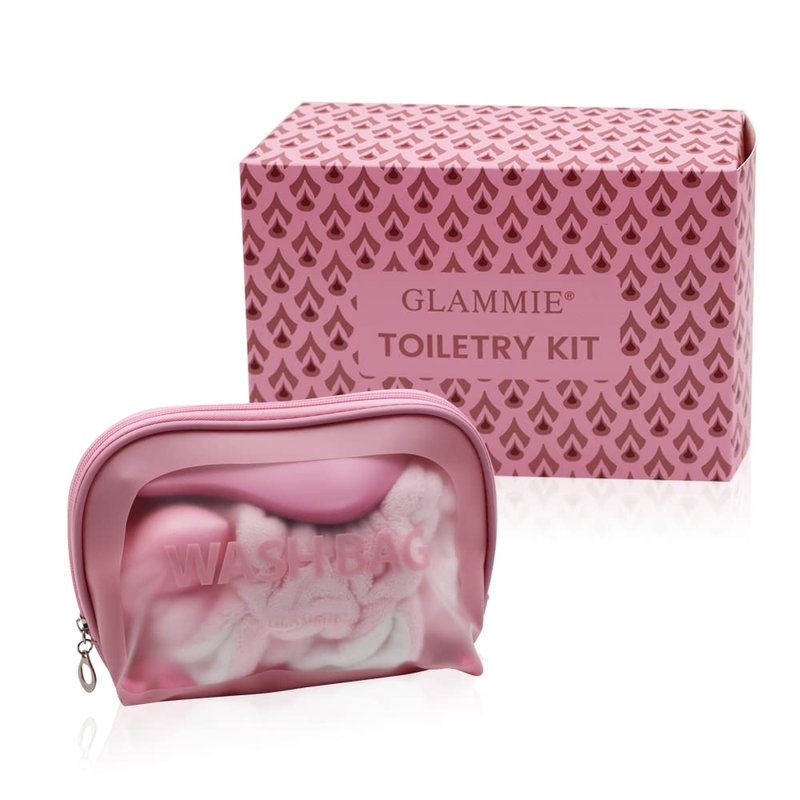GLAMMIE Travel set with Makeup Bag, Hair Drying Towel, Facial Scrubber, Makeup Remover Wash Cloths, Hair brush, Face Wash Headband, Satin Scrunchies, this set is women's makeup, hair care, fitness...