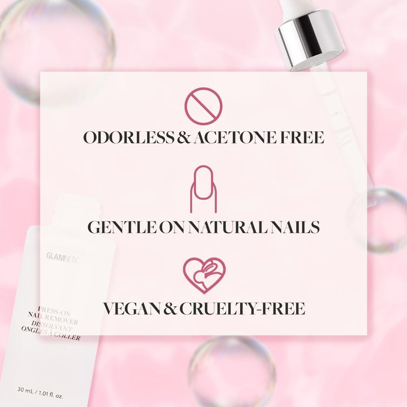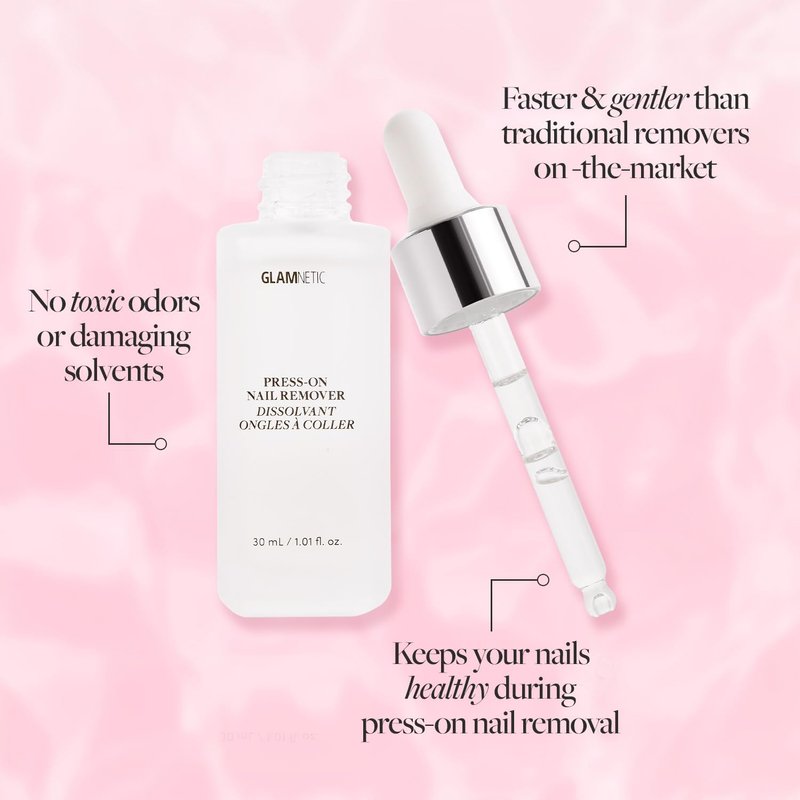 - Gentle Press-On Nail Remover Serum: Remove your press-on nails in a breeze! You can now bid adieu to your Glamnetic press-on nails gently, quickly and painlessly - ready to apply a fresh set with no harm done! Say bye to traditional removers with toxic odors and damaging solvents, and hello to fresh, healthy nails with every new look.